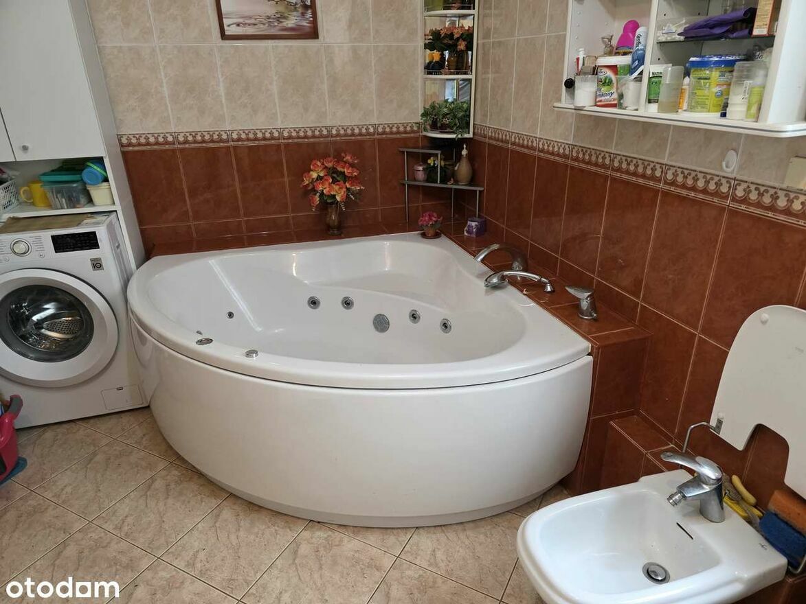 - Piętro: 3 pokoje, w tym jeden z wyjściem na taras. Łazienka z dużą wanną z hydromasażem i bidetem, to oaza relaksu.