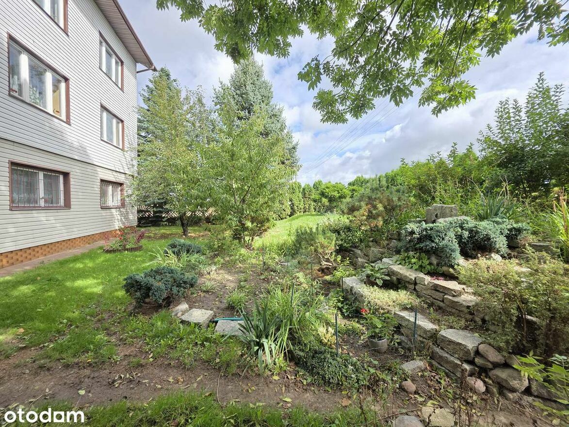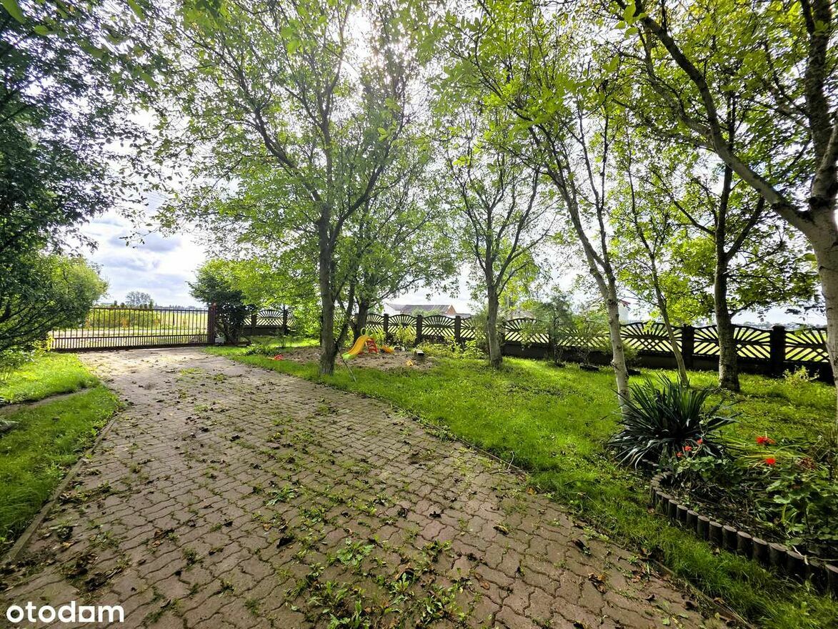 Działka jest w pełni zagospodarowana z licznymi nasadzeniami, które tworzą idealne miejsce do wypoczynku. Otoczenie domu jest pełne zieleni, z ogrodem, który jest widoczny na zdjęciu z perspektywy posesji.