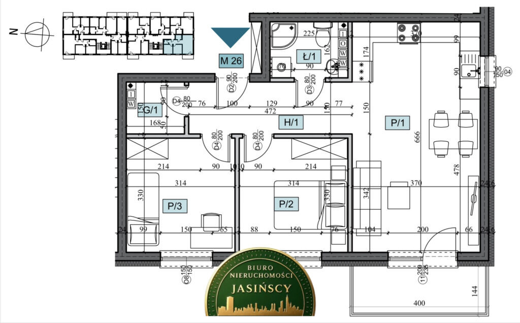 3 pokoje (w tym 1 z aneksem kuchennym)łazienkęgarderobębalkon o